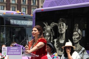 Acompañada de mujeres mazahuas, tzotziles, tzeltales, mixtecas y otomíes la mandataria capitalina subrayó desde el Zócalo, que la nueva ruta del Centrobús busca visibilizar a “grandes mujeres indígenas que resistieron, lucharon, cuidaron y sostuvieron pueblos y comunidades enteras y que nunca fueron reconocidas”, como Atotoztli, Tecuichpo Ixcaxochitzin, Malintzin, Eréndira, la Señora Seis Mono, Pupualtzin, y muchas otras que “hoy regresan al espacio público como símbolos de nuestra memoria”.